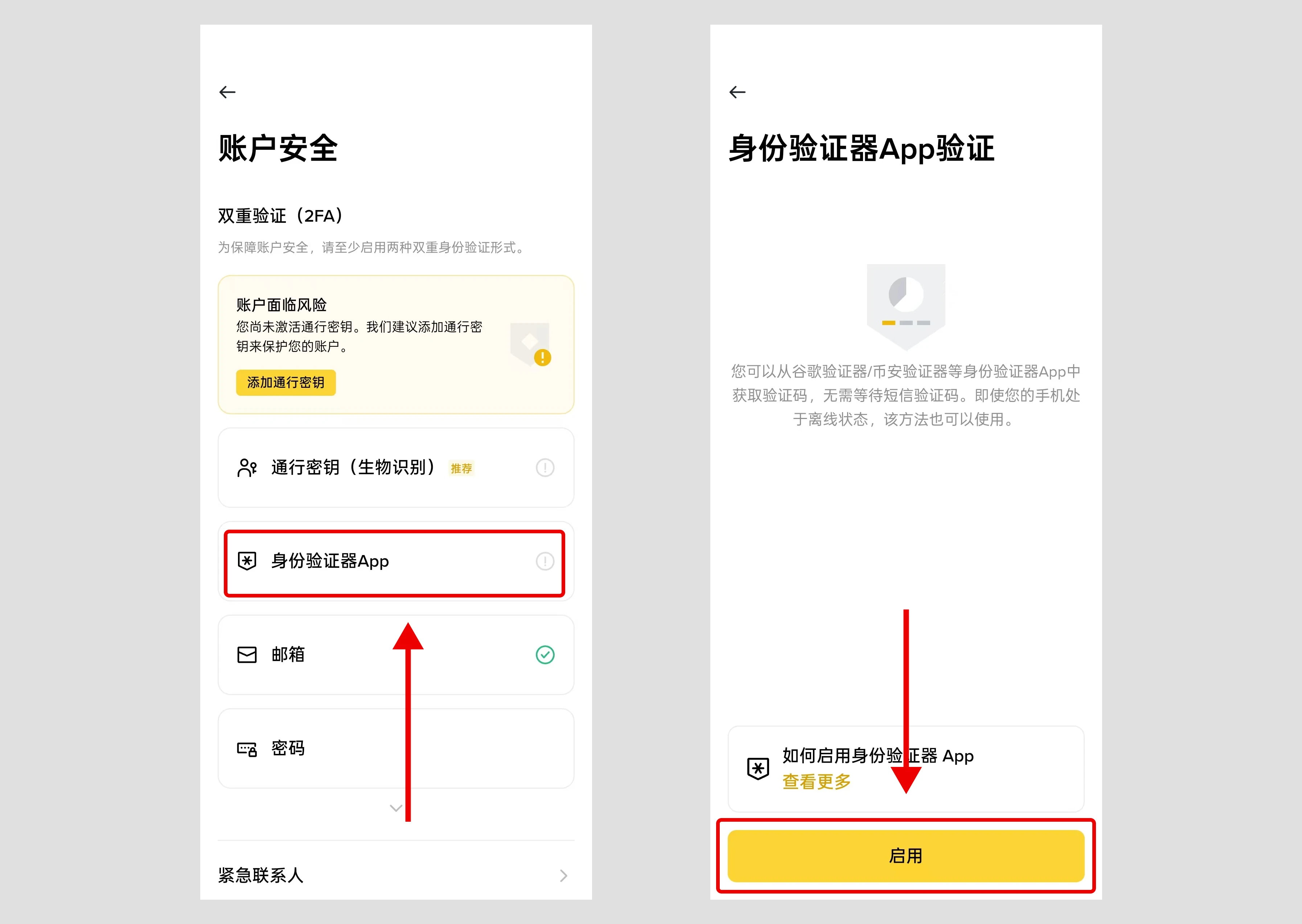 在账户安全页面下点击“身份验证器app”,然后再点击“启用”按钮