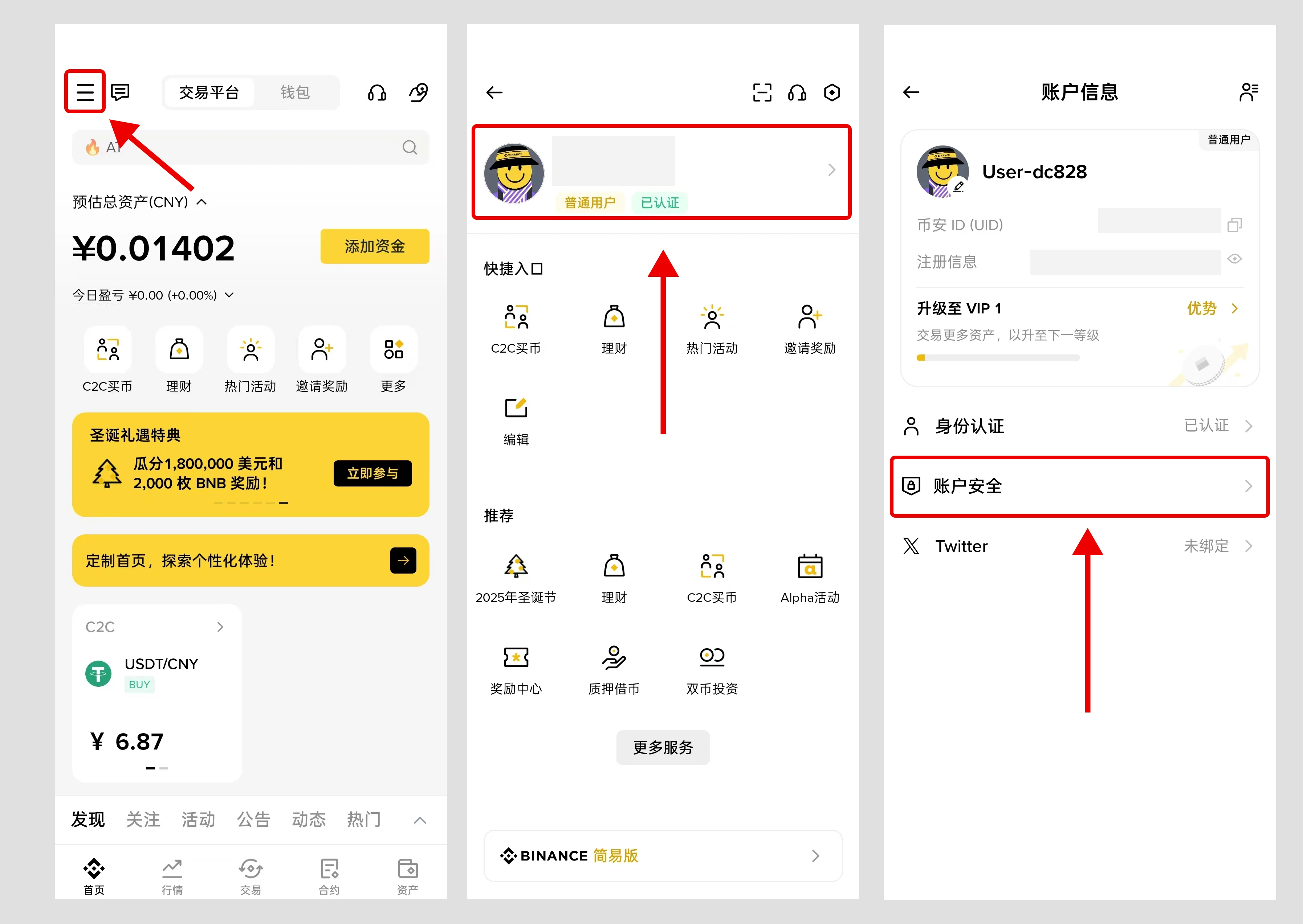 ①登录币安客户端后,打开左上角的菜单项; ②进入对应页面后,点击头部的账号区域; ③在账户信息页面点击“账户安全”。