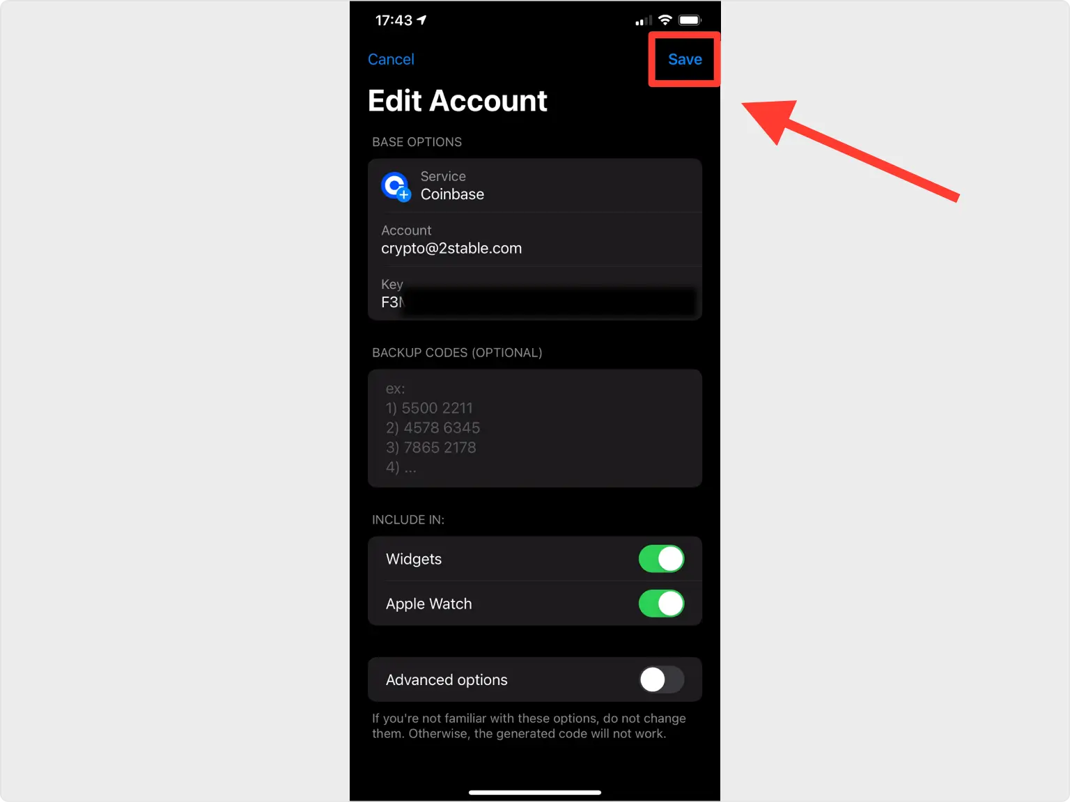 成功扫描二维码后,身份验证器应用会自动选择 Coinbase 图标,并自动填充账户名称和密钥。您可以根据需要更改图标或账户名称。准备就绪后,点击“保存” 。