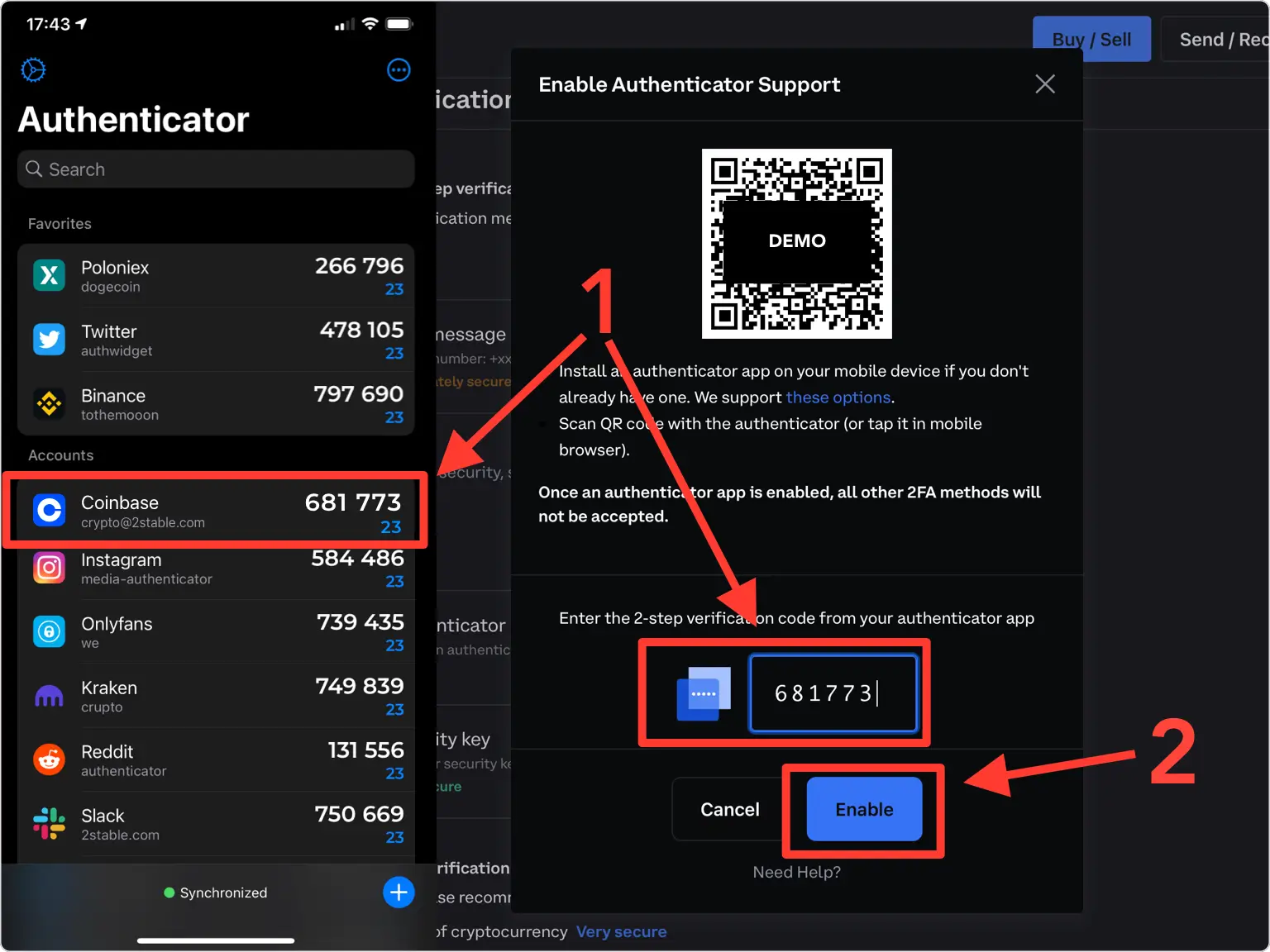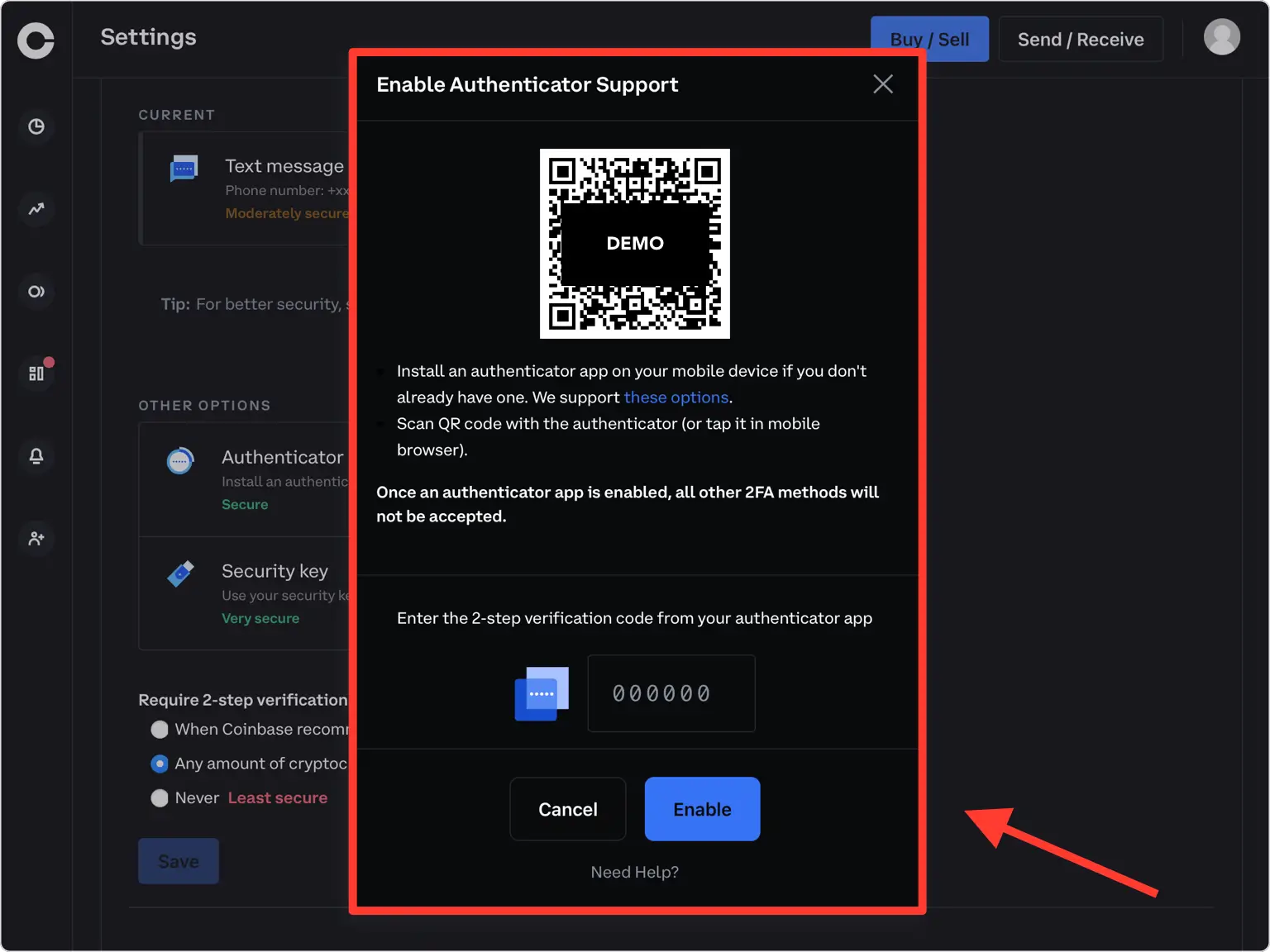 复制身份验证器应用程序提供的数字代码,并在Coinbase网站上进行确认,然后点击“启用”。请注意,此代码每 30 秒刷新一次。