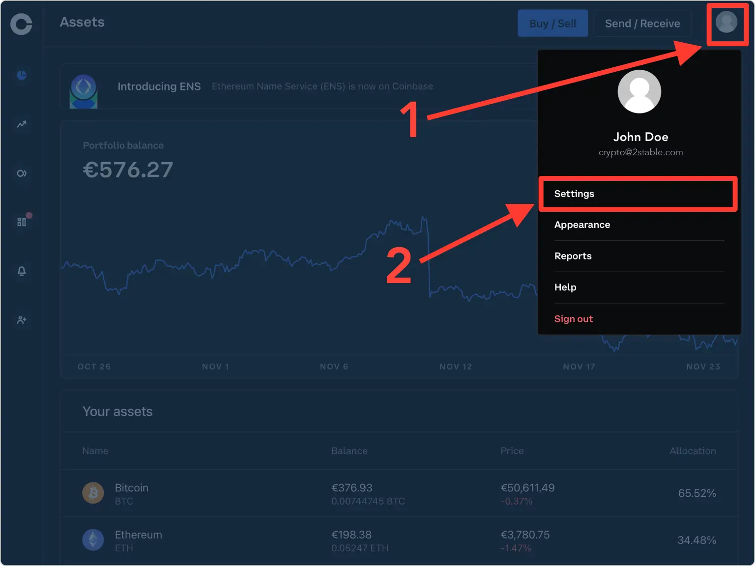 登录您的 Coinbase 账户,点击右上角的“账户” ,然后选择“设置”。